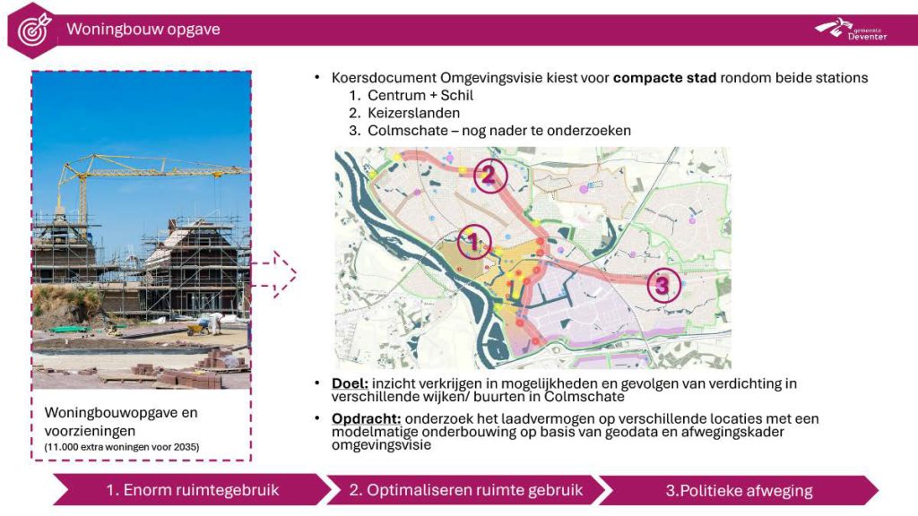 Deventer is growing, and rapidly. Not only in terms of population, but also in terms of ambition. Margriet Achtereekte, Geovisie Leader for the municipality of Deventer, outlines the dilemma: “The total surface area demand is much larger than Deventer’s available surface area.” This presents significant challenges. Deventer needs to build 11,000 homes by 2035, and there’s also a need for a new business park, substantial investments in energy infrastructure, and the challenge of greening the city.