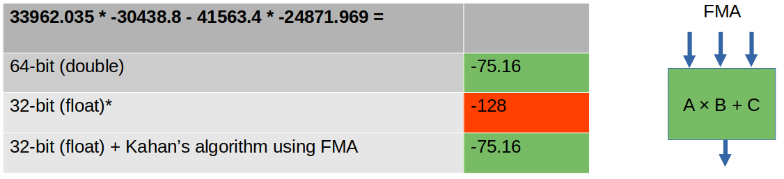 To tackle this issue, we revisited older works by William Kahan, winner of the famous Turing Award (“Nobel Prize of Computing”) for his contributions to numerical analysis. In the 1960s and 1970s, computing power was limited and expensive, prompting Kahan to develop algorithms to compensate in summations. But later also differences in products, for instance: 33962.035 * -30438.8 – 41563.4 * -24871.969 in 32-bit yields an incorrect result.